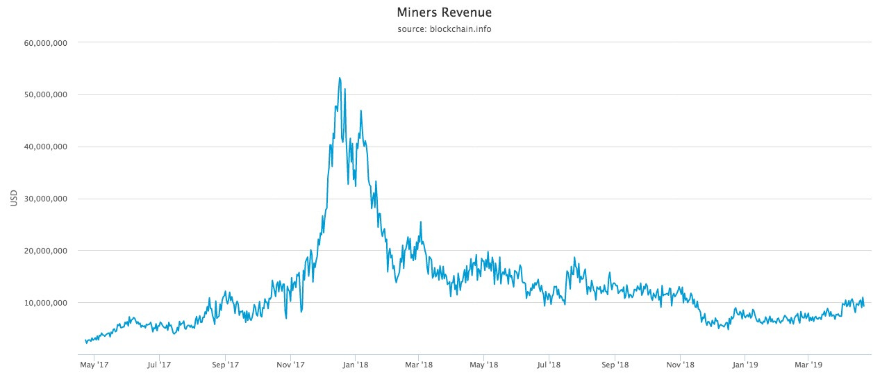 Miners are making almost 3.5x more Bitcoin (in USD value) on a daily basis than they were two years ago.