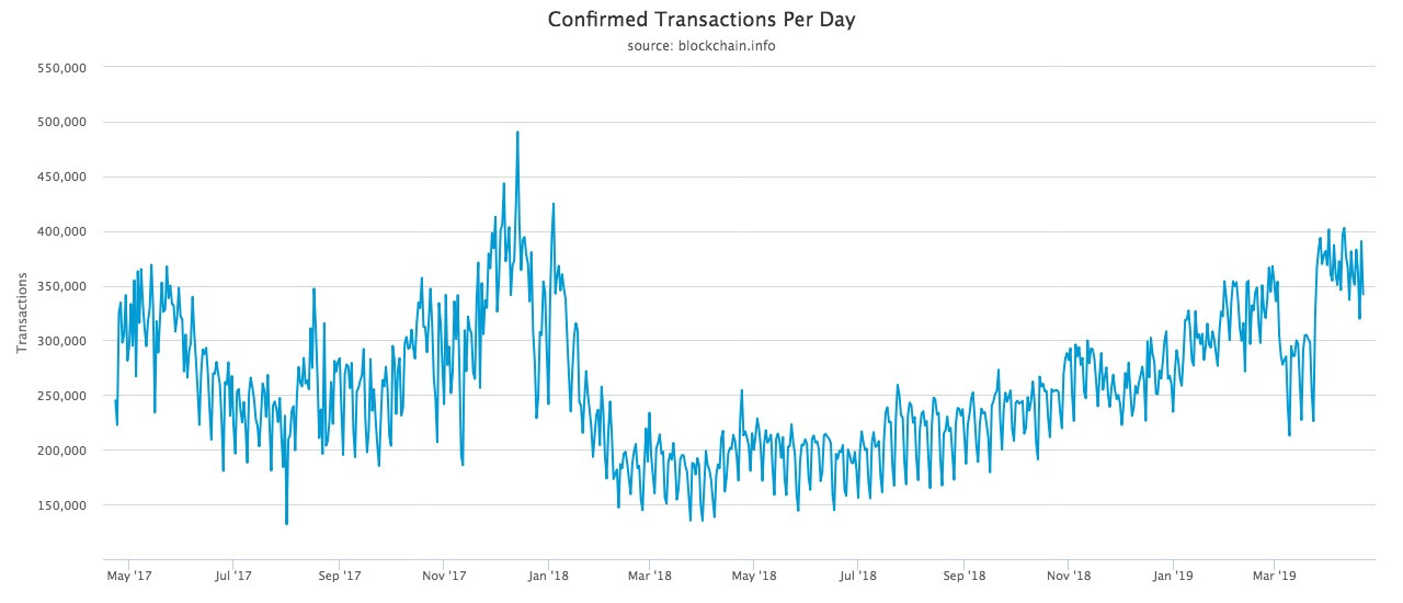 The number of transactions per day on the Bitcoin blockchain have increased over 70% in the last two years and continues to rise over the last 12 months after hitting a local low point in May 2018.
