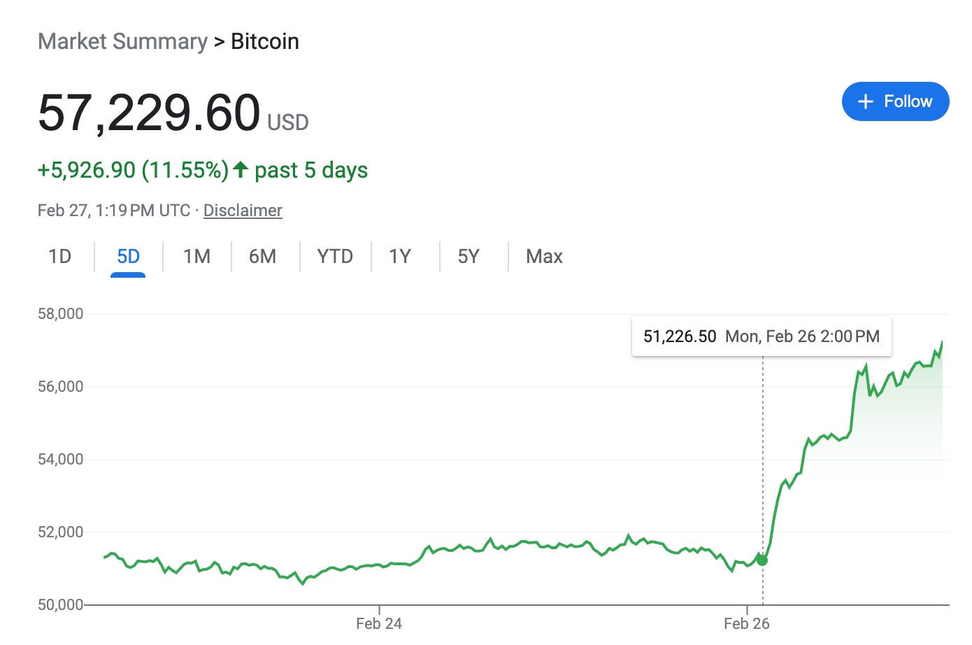 Bitcoin went vertical yesterday. The digital currency is up more than 11.5% in the last 24 hours. This type of performance is rare in financial markets, especially if there is no obvious catalyst such as an earnings announcement or M&A activity.