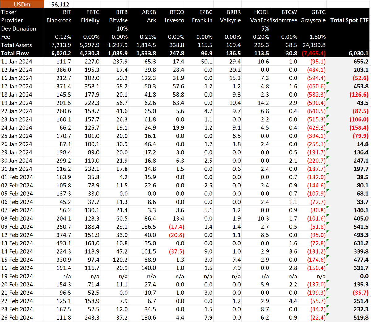 The ETFs have also officially crossed over $6 billion in cumulative net inflows since launch. Blackrock’s fund has $7.2 billion in assets as the leader and there are 5 ETFs with at least $1 billion in AUM. The launch of the bitcoin spot ETFs have been the single greatest launch of any ETF in history by almost every measurement.
