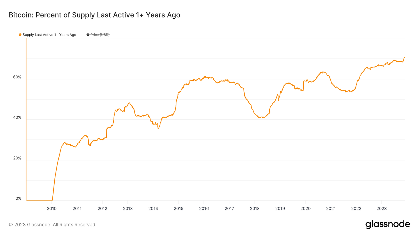 Speaking of prices, bitcoin holders don’t appear to have any interest in selling into the strength of bitcoin’s price. Although the price is up almost 150% year-to-date, the amount of bitcoin in circulation that hasn’t moved in 1+ year hit a new all-time high over the weekend of 70.5%.