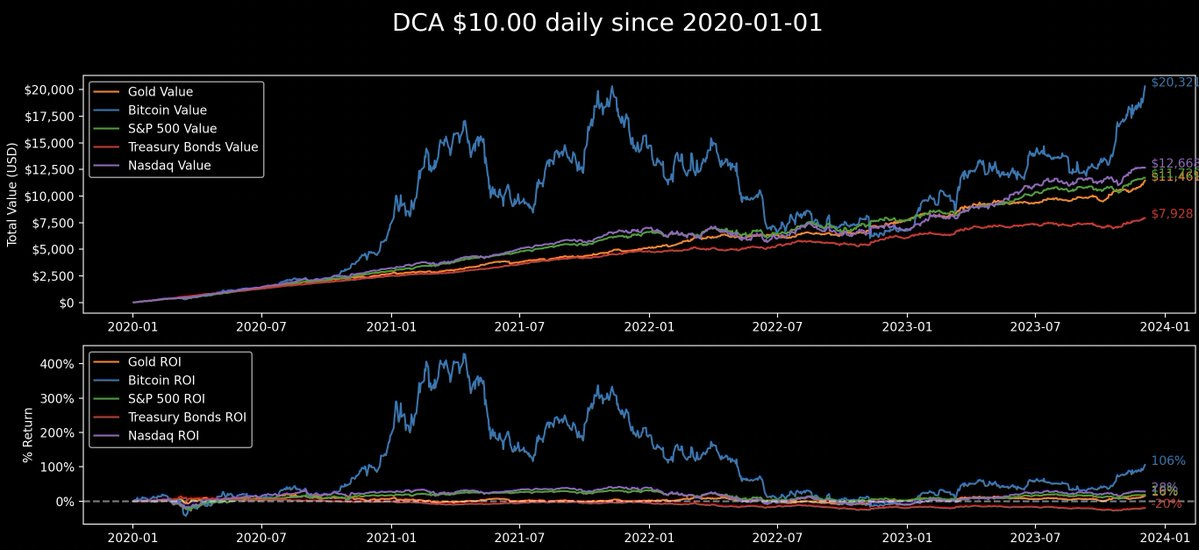 The nation states and corporations are not the only beneficiaries of the recent bitcoin price increase though. As Dylan LeClair pointed out, bitcoin is the significant winner if you had dollar cost averaged with $10 into various assets every day since 1/1/2020.
