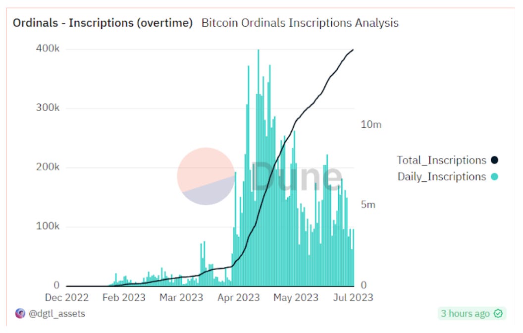 One of the biggest stories for the quarter for Bitcoin that has been drowned out by the ETF developments was the massive influx in ordinals usage. This influx in ordinals usage began in early April as the total number of inscriptions blew past 10 million and is now at 14,756,276. In total ordinals inscriptions have generated over $56 million in fees for the network to date. While the hype around ordinals has come from scorching hot down to a simmer, this will be a space to continue to keep an eye on over the coming quarters.