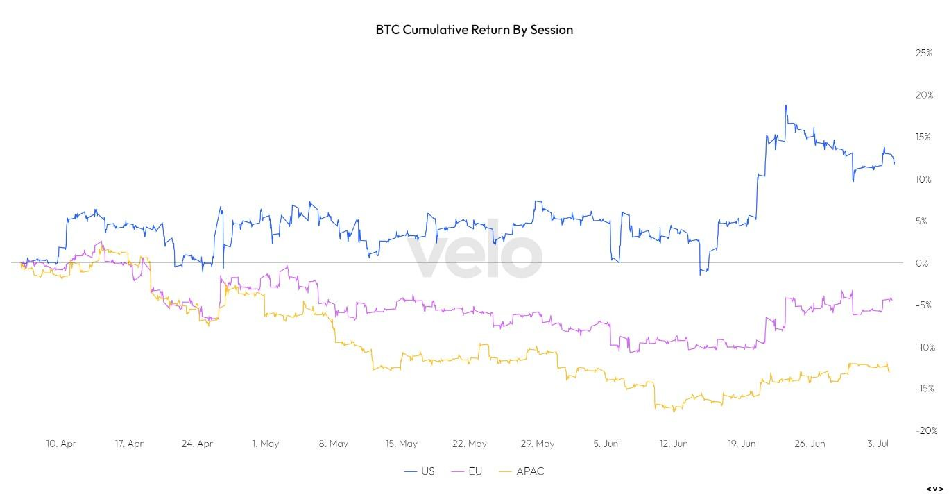 Who has been driving this performance for Bitcoin? When we look at Bitcoin’s cumulative return by regional trading hours (US, EU, and APAC) we can clearly see that the majority of Bitcoin’s performance has occurred during US trading hours, particularly following the Blackrock ETF filing. This is also true when looking at Coinbase’s trading premium relative to other venues.