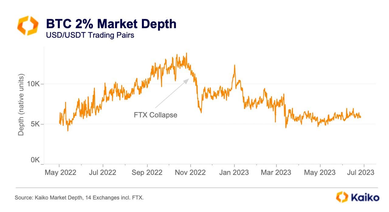 Despite the positive YTD price appreciation, liquidity for Bitcoin remains relatively muted with regulatory uncertainty still looming and many market participants still licking their wounds from the counter-party risk left over from a year of crypto company blowups throughout 2022. Here we define liquidity as looking at the coin denominated bids and asks in the order books between current trading price and moving price 2%.