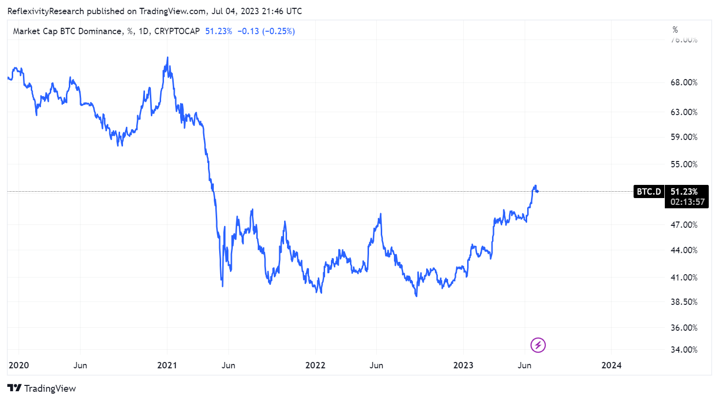 Bitcoin has been provided with the tailwind of two events this year with the SVB banking crisis and Blackrock Bitcoin ETF filing that have unequally benefited digital gold relative to the other digital assets in the market. This has translated to Bitcoin’s market capitalization dominance relative to the rest of the market breaching 50% for the first time since early 2021.