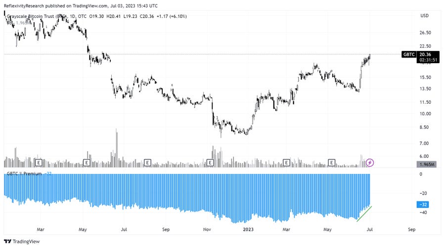 The ETF trade is in full effect with Coinbase, the exchange that Fidelity, Blackrock, and others have opted into a shared surveillance agreement with for their ETF filings, having rallied 70% this month. In addition, we have seen the GBTC trade being put on as the trust’s discount to NAV has dropped to its lowest levels in nearly a year.