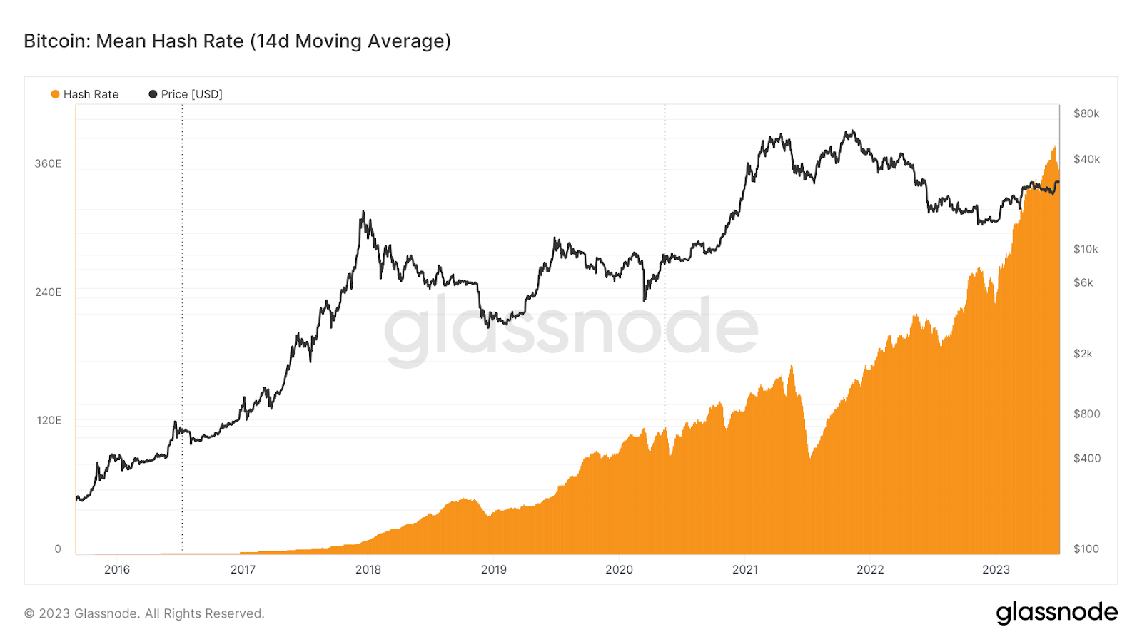 Bitcoin’s hash rate has also continued to increase, making consistent new all-time highs as a reflection of more demand to mine the digital asset as well as more efficient rigs being brought online.