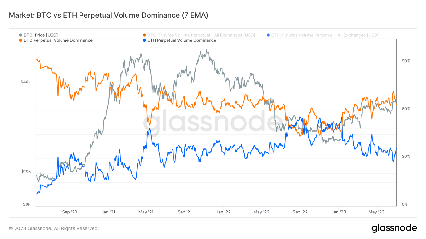 In addition, we’ve also seen volume for Bitcoin perpetual futures clearly diverging from Ethereum perpetual futures, showing a shift in interest from traders towards Bitcoin relative to the #2 asset by market capitalization.