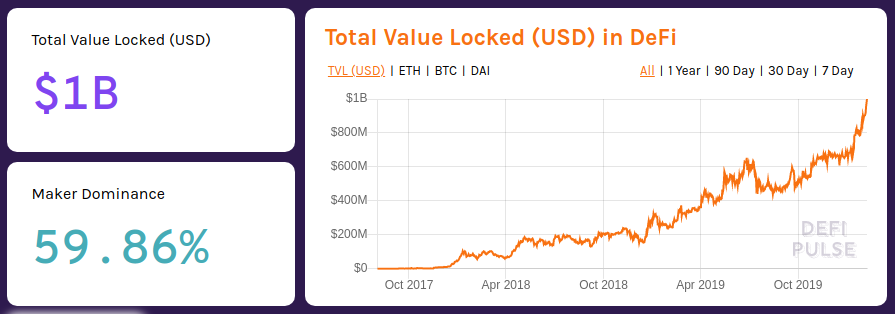What is interesting is that the DeFi movement is continuing to grow at an impressive rate. There was a recent milestone that highlighted more than $1 billion is locked up in the ecosystem (a core metric to measure growth of DeFi), which approximately 60% coming from the Maker / DAI system.