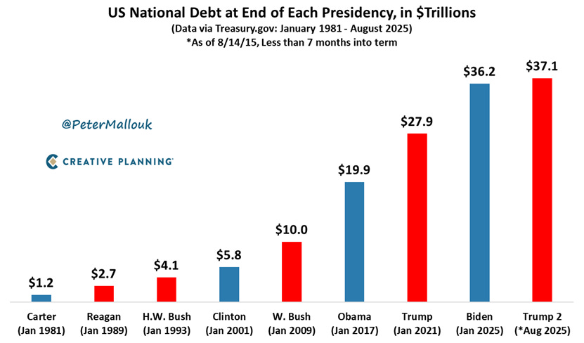 Creative Planning’s Peter Mallouk writes “Red or Blue, the national debt goes up. The only thing both parties can agree on is sending the bill to future generations. Next stop: $38 trillion.”