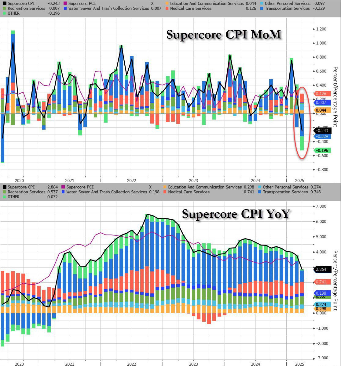According to EndGame Macro, “Supercore CPI MoM (circled) is collapsing that’s a clean signal of demand-side weakness across sticky services, especially discretionary buckets like travel, recreation, and healthcare. That supports the “disinflation is real” narrative.”