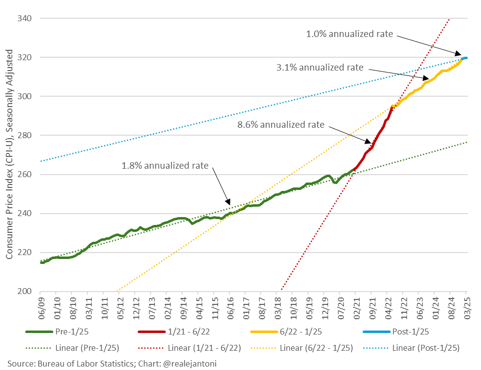 Maybe the most important part of this slowdown in inflation is the structural change that seems to be underway. Heritage’s EJ Antoni writes the “average annual inflation rate from '09 until '21 was 1.8%, then Biden drove it up to 8.6% for a year and a half, then it rose steadily at 3.1% for the rest of his term; but now Trump is averaging a mere 1.0%.”