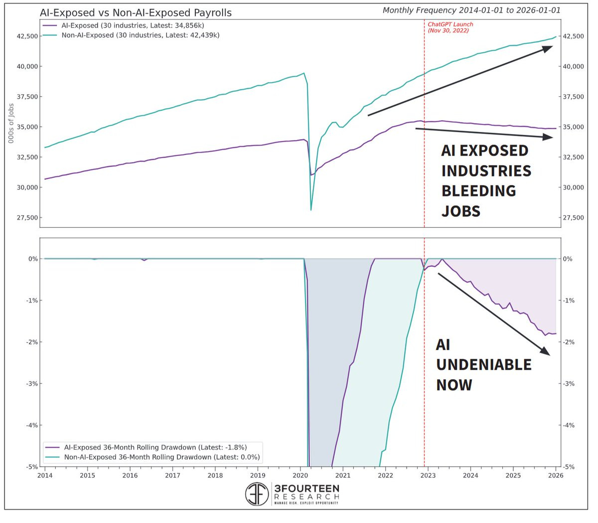 3Fourteen’s Warren Pies writes “AI’s impact on the labor market is no longer theoretical. In the most AI-exposed industries, job losses are accelerating (especially compared to their pre-AI trend growth). AI resistant industries continue to add jobs. As the year progresses, expect this wedge to grow.”