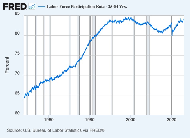 Eddy Elfenbein writes “the labor force participation rate for prime-working age people is at a 25-year high, and it’s close to an 80-year high (as far back as the data goes).”