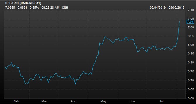 The Chinese yuan broke 7 for the first time in a decade on Sunday night. China’s government continues to depreciate their currency in response to the tariffs and threats of President Trump and the United States.