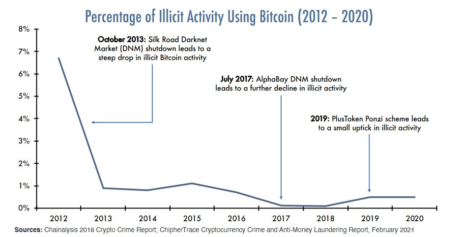 Now here is one of the interesting things about the rise in ransomware and other illicit transactions using bitcoin — the number of transactions are growing in aggregate, but the percentage of total bitcoin transactions is actually dropping. Here is a graphic from Michael Morrell, the former acting CIA Director, in a report that he published last April showing that less than 0.5% of all bitcoin transactions are for nefarious or illicit purposes.