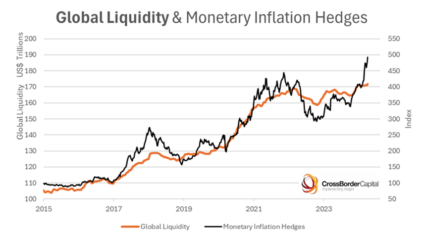 Why do I say that monetary hedges will do well over the long run? Because global liquidity has to continue expanding if we want to avoid catastrophe in major economies.