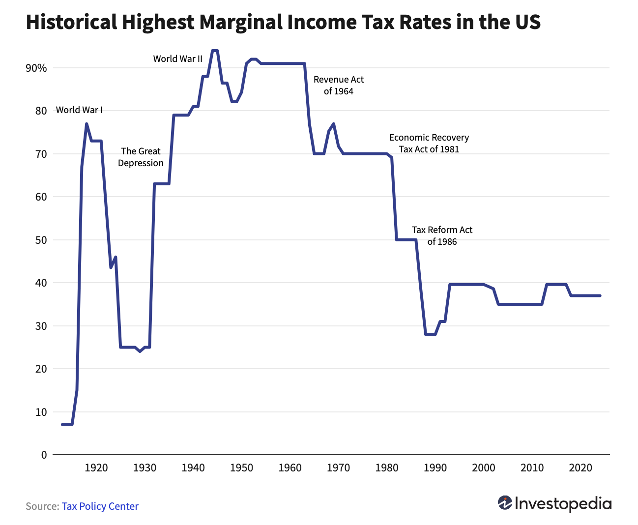 At one point, the highest marginal tax rate in the United States reached 94% during 1944 and 1945.