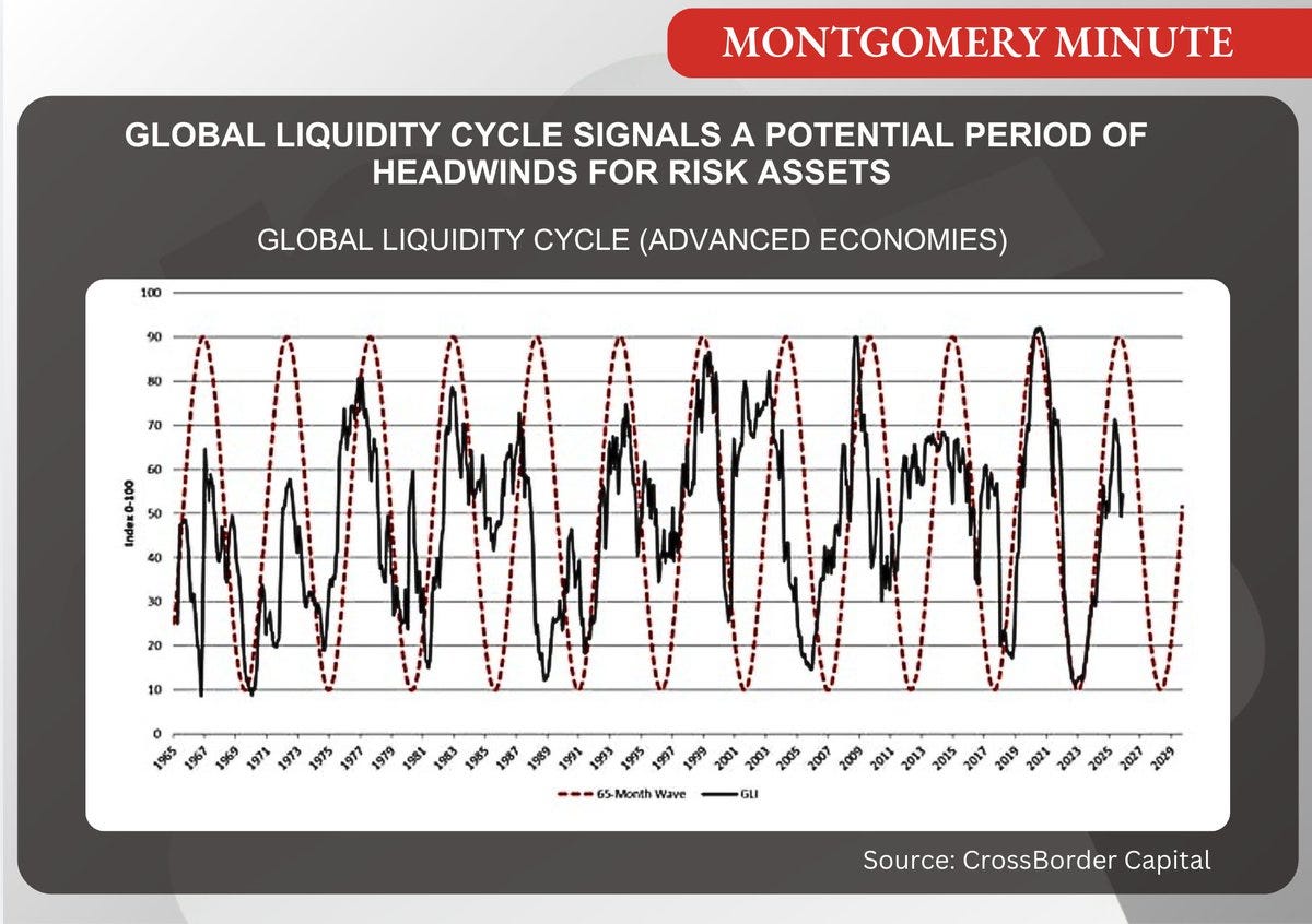 Roger Montgomery points out that “Cross Border Capital’s Michael Howell believes a 5-6-year cycle exists in the underlying momentum of the components of global liquidity. Right now, the outlook is bleak because Global Liquidity has peaked, is entering a downswing, and the next trough isn't expected until 2027.”