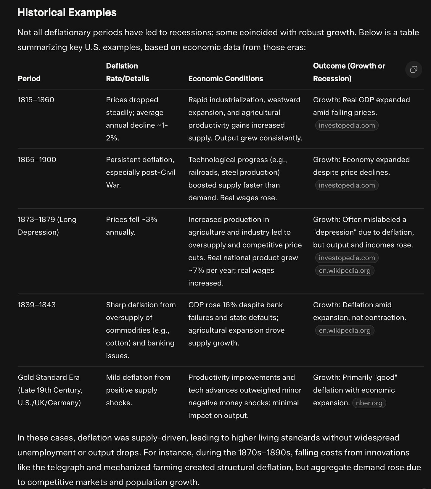 Getting this balance right is very important. You want deflation without recession. This can only be done by creating positive supply-side factors rather than a collapse in demand. This is often called “good deflation” or “growth deflation,” where prices fall due to increased productivity, technological advancements, or efficiency improvements that boost output and real incomes.