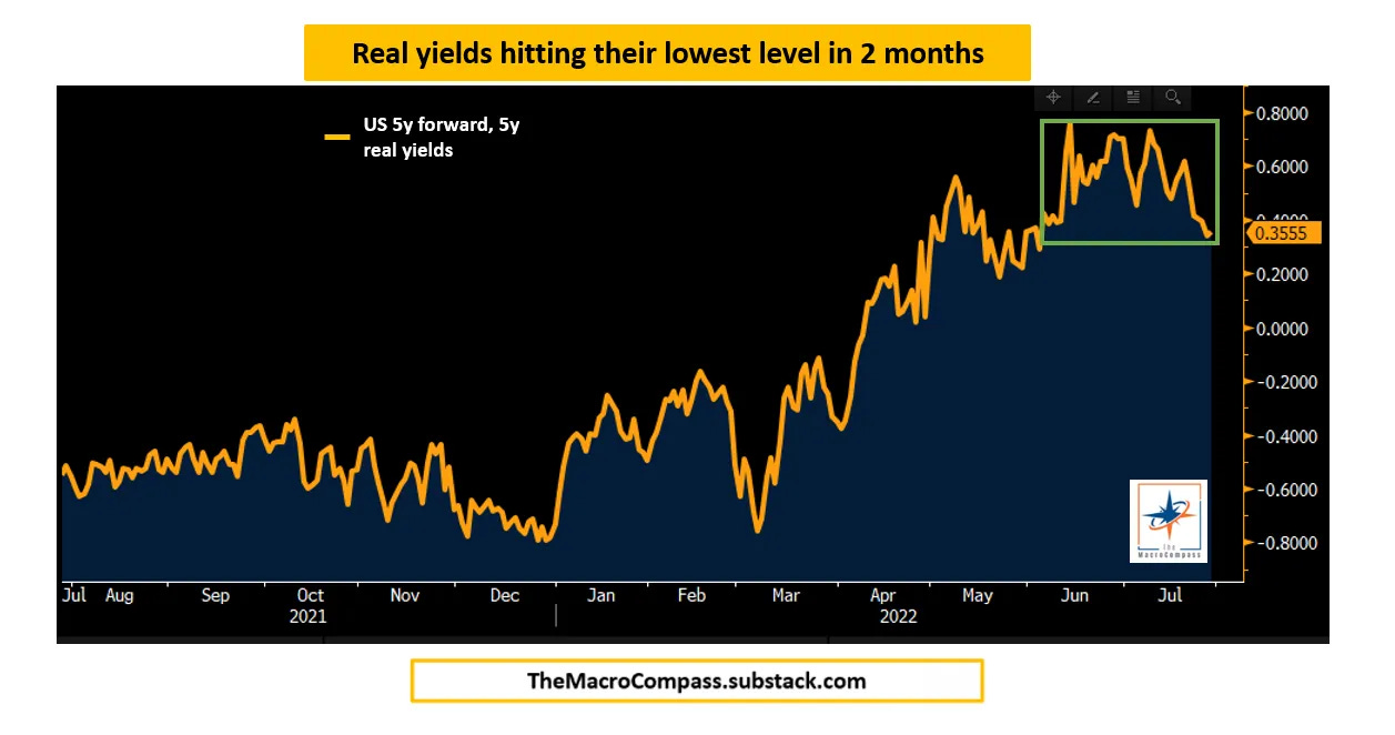 If the Fed isn’t gonna blindly keep hiking but be more data-dependent, contingent on their view that CPI will quickly come down traders have a green light to price a more nuanced tightening cycle and hence still restrictive real yields but less so than before.