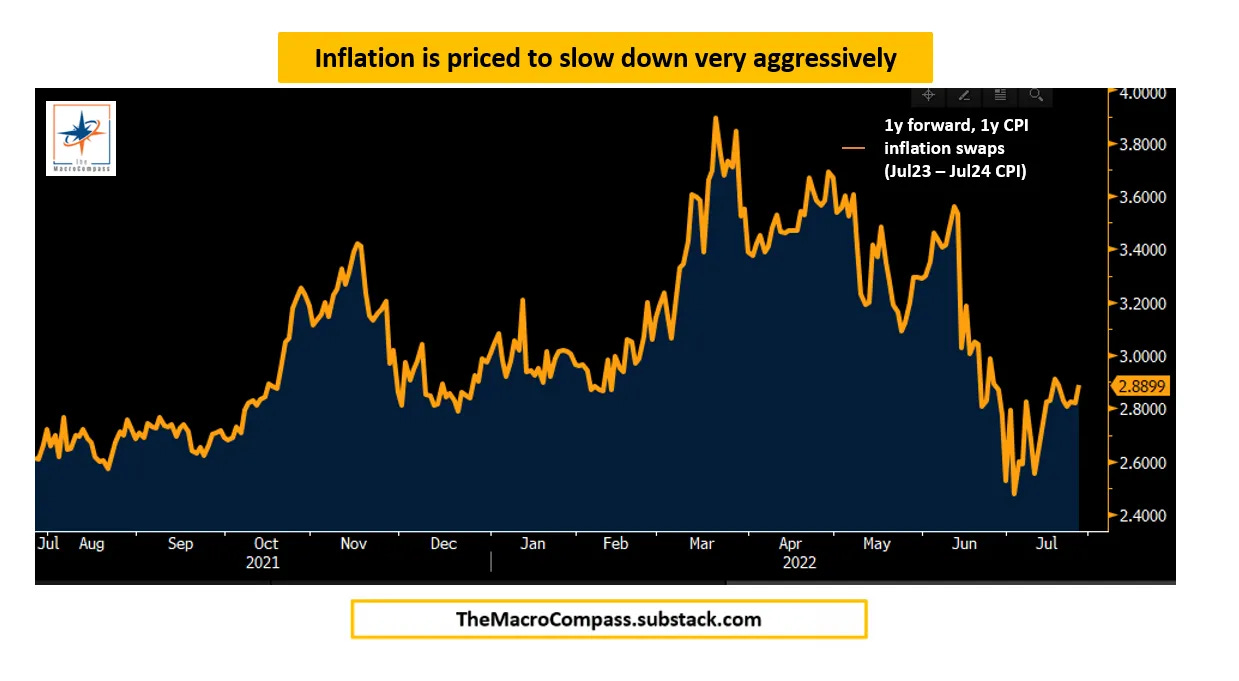 Using CPI inflation swaps, I calculated the 1y forward, 1y inflation break-evens (CPI) in the US - basically the expected inflation between July 2023 and July 2024 which is represented in the chart above and sits at 2.9%.