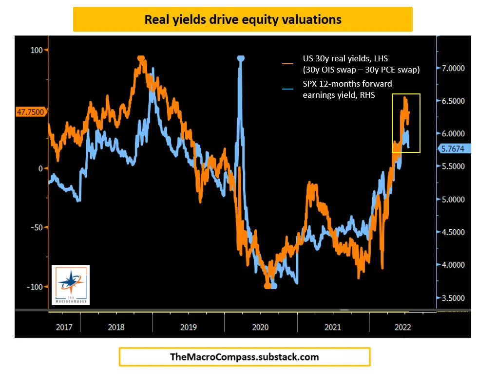 Here is a chart showing the very tight relationship between real yields and equity market valuations.