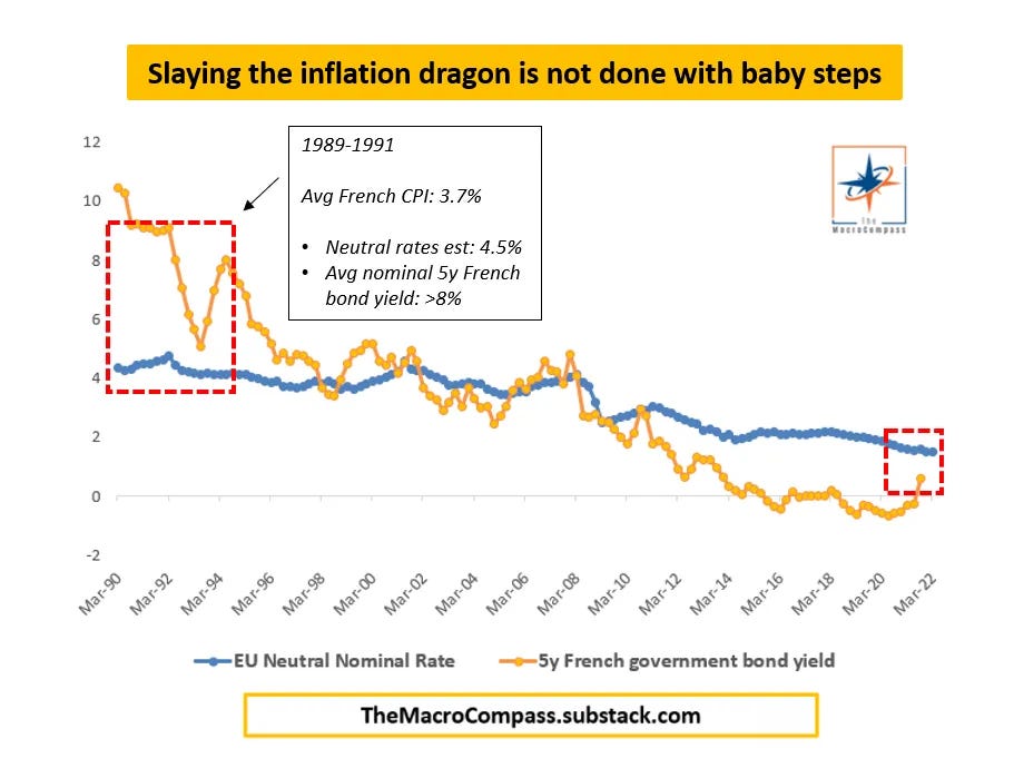 For instance: last time inflation was stubbornly high in France, the Central Bank had to bring nominal yields (orange) all the way to 8% and keep them there for years to slow CPI down - way above my estimate of the prevailing neutral rate (blue) at 4.5%.