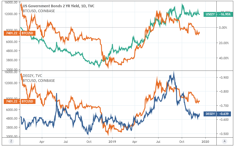 BTC (Orange) vs. Inverted 2-Year U.S. (Green) & German (Blue) Government Bond Yields