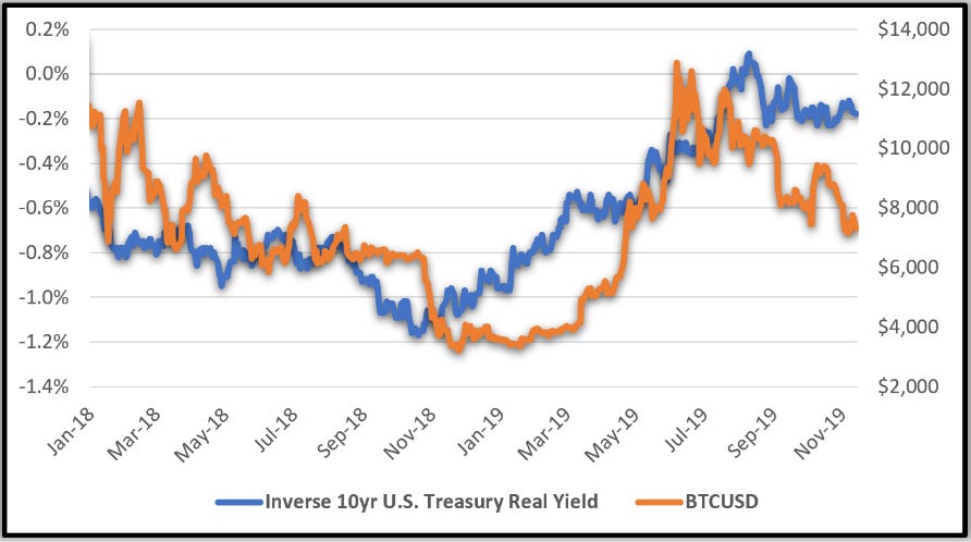 BTC (Orange) vs. U.S. 10-Year Treasury Real Yield (Inverse)