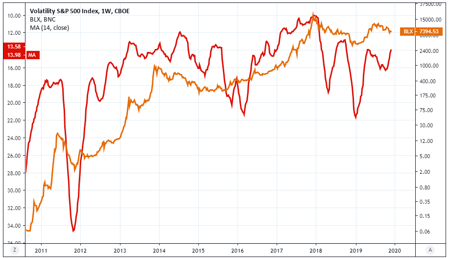 BTC (Orange) vs. 14-Week Moving Average of VIX Index (Inverted)