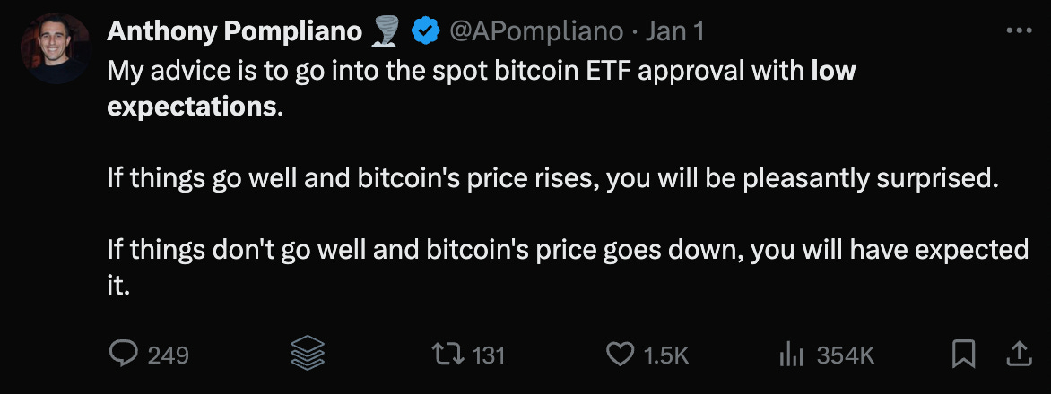 As I said going into the bitcoin ETF launch, keeping low expectations would be helpful for many people reading this letter.