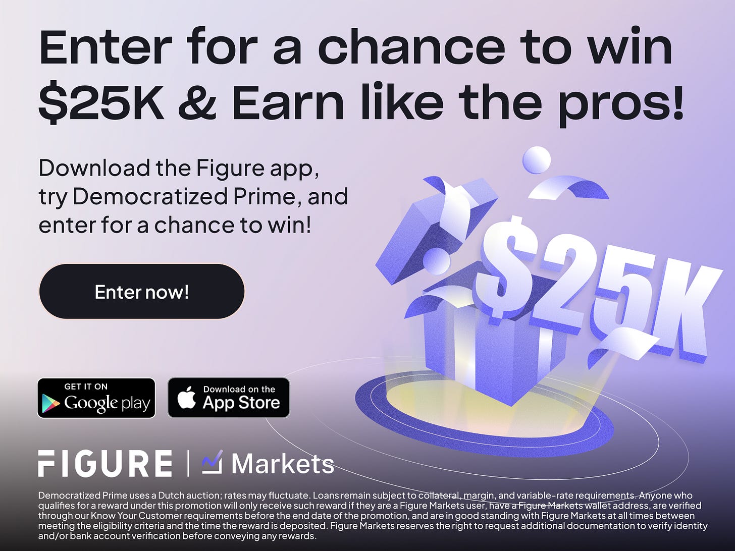 *Democratized Prime uses a Dutch auction; rates may fluctuate. Loans remain subject to collateral, margin, and variable-rate requirements. Anyone who qualifies for a reward under this promotion will only receive such reward if they are a Figure Markets user, have a Figure Markets wallet address, are verified through our Know Your Customer requirements before the end date of the promotion, and are in good standing with Figure Markets at all times between meeting the eligibility criteria and the time the reward is deposited. Figure Markets reserves the right to request additional documentation to verify identity and/or bank account verification before conveying any rewards.