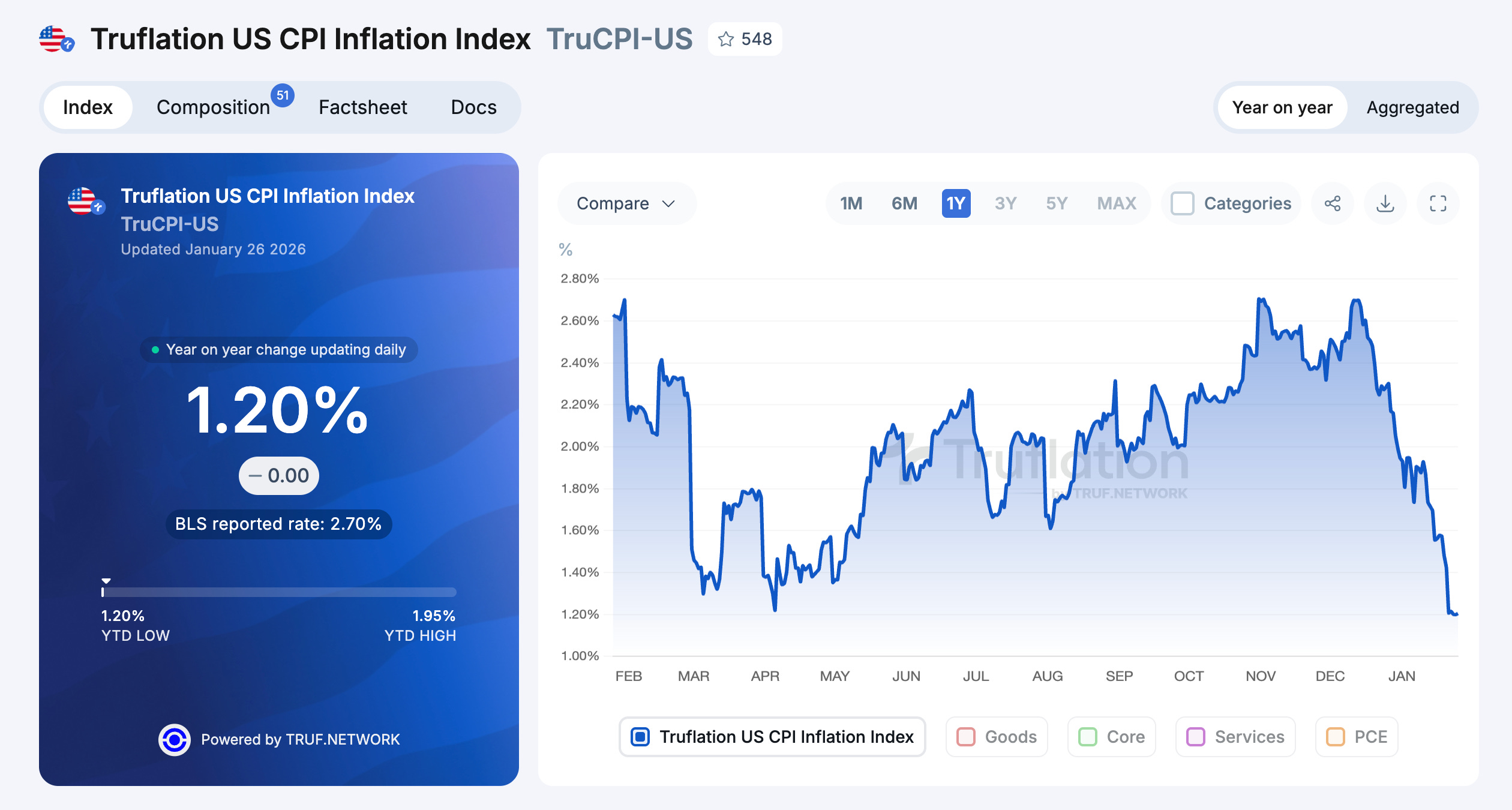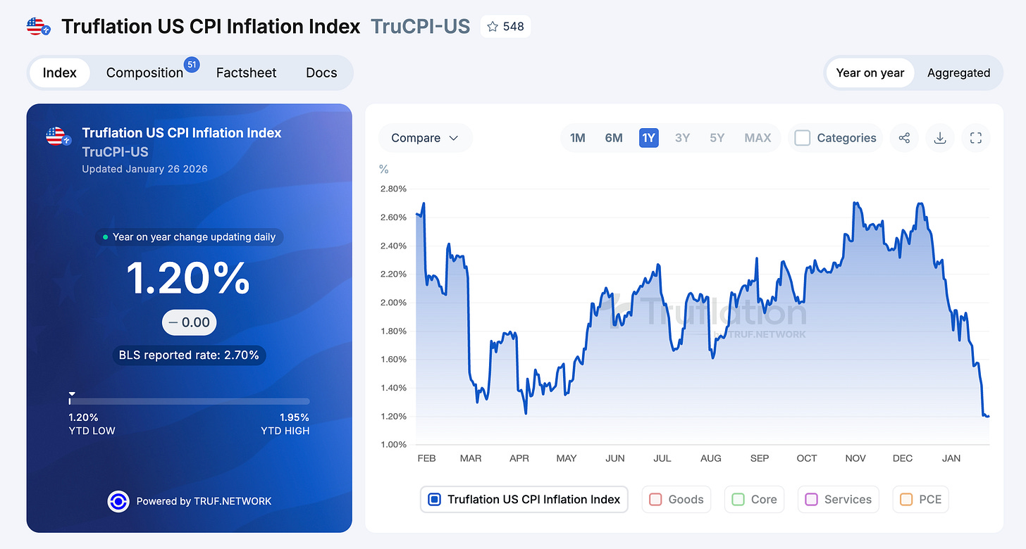 Truflation’s real-time data, which is sourced from over 14 million daily price points across 40+ independent providers, captures this deceleration far faster than traditional metrics, revealing a pricing environment that’s shifted decisively toward disinflation. For investors, this signals a fundamental reset in cost pressures that official data will only confirm weeks later.
