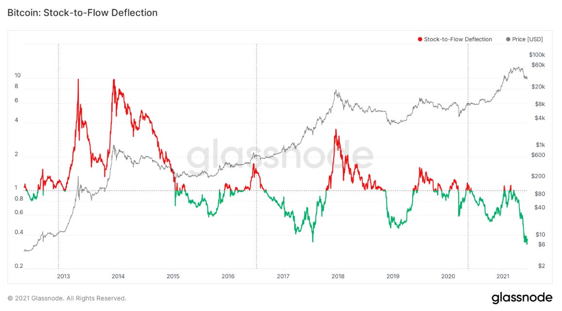 Plan B’s stock to flow is currently having the largest deflection from the model price in its history. We’re sitting on the lower bound of the model’s outer band. If the model is going to stay valid price needs to start moving up soon.