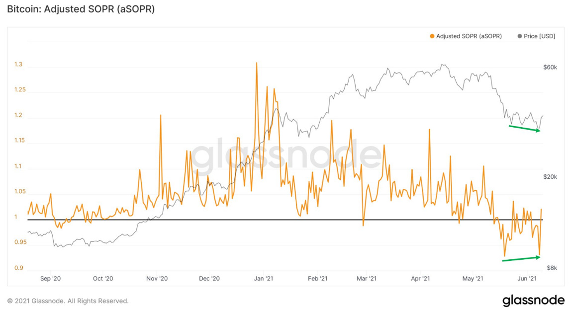 Back above the 1.0 threshold (coins are no longer being sold at a loss)