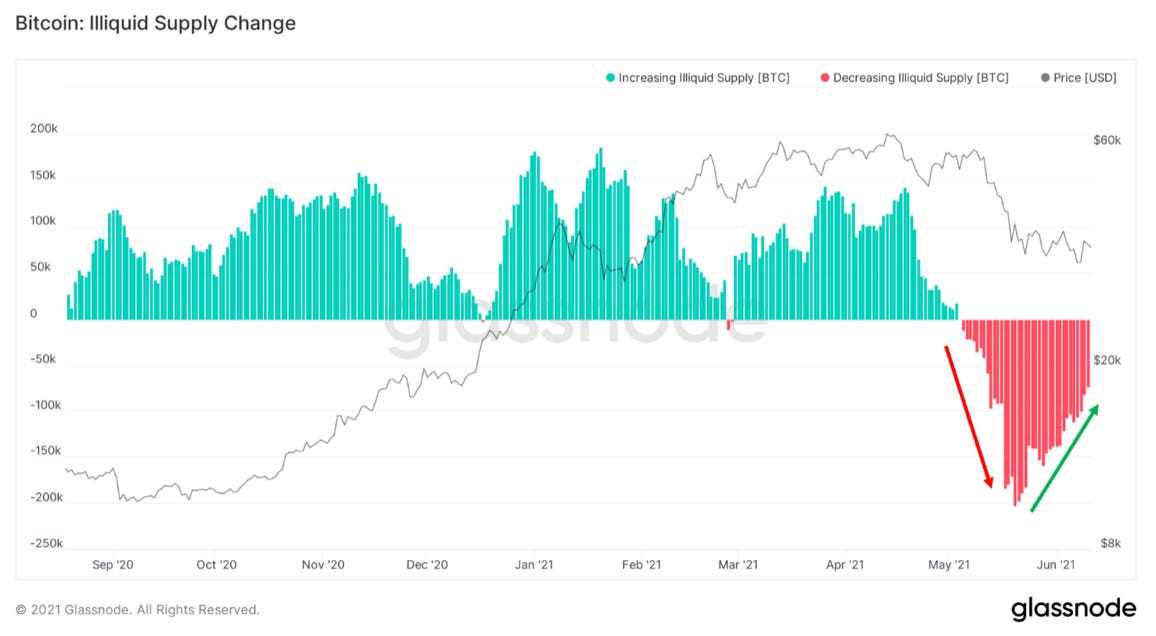 Another metric to look to asses accumulation is illiquid supply change. This is one of the main metrics that had been talked about throughout the early bull market, showing strong accumulation. It was even dubbed the “Rick Astley Indicator” by Willy Woo, given that these holders appeared that they were never gonna let us down. However, this metric flipped from strong accumulation to distribution quite rapidly at the end of May/early June as a lot of coins that appeared to be in strong hands were sold off amidst the price drop. However, since the price drop, this metric has started slipping back into what can be thought of as accumulation/strong hands.