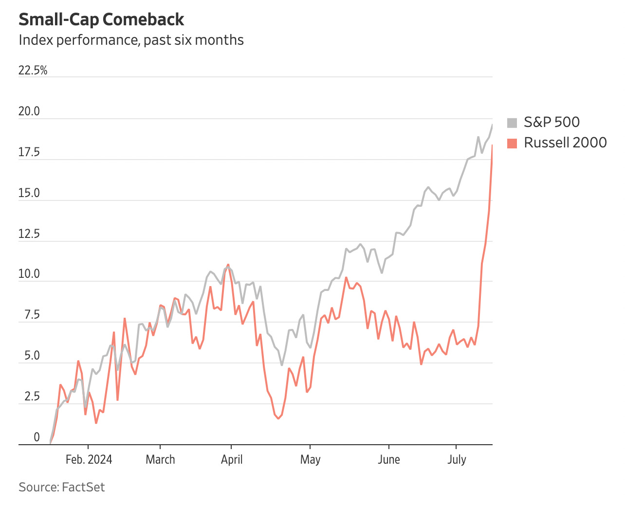 Take the Russell 2000 as an example. Hannah Miao of the Wall Street Journal points out the small cap index has lagged the S&P 500 significantly for the last 6 months, but that has drastically changed in the last few days.