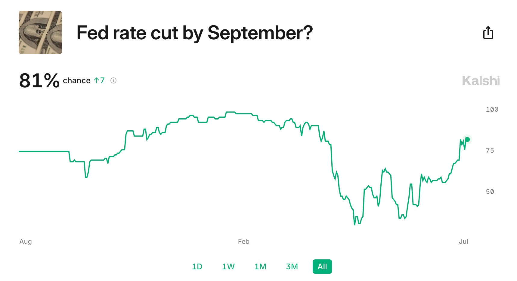 Prediction markets like Kalshi are also showing a significant increase in interest rate cut expectations recently. Odds now stand at 81% for a rate cut by September according to the market.
