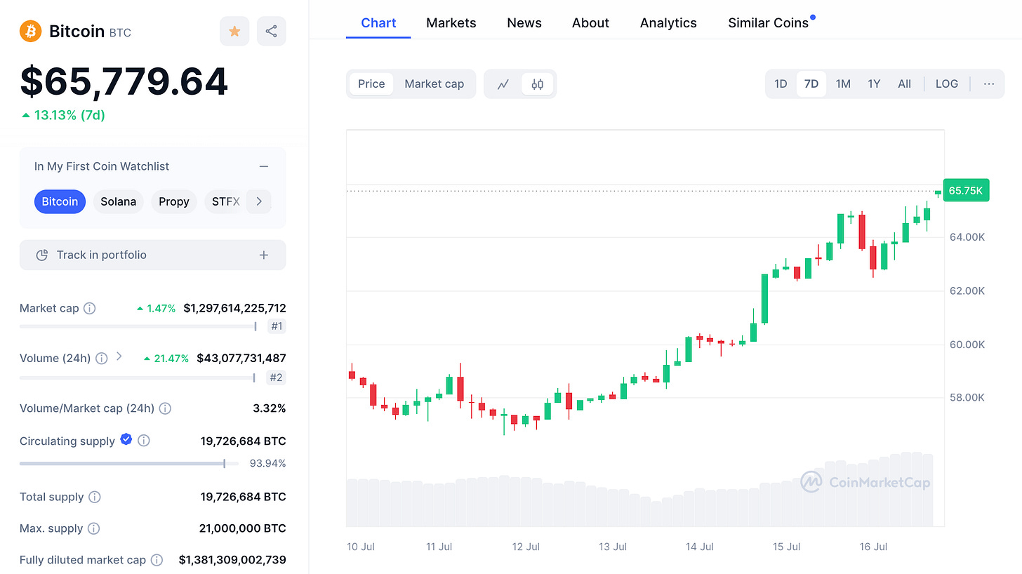Bitcoin, one of the best free market signals that we have, has increased in price by more than 13% over the last 7 days. This type of strength has historically been reserved for significant changes in investor expectations, which is obviously happening as Trump’s odds of victory continue to grow.