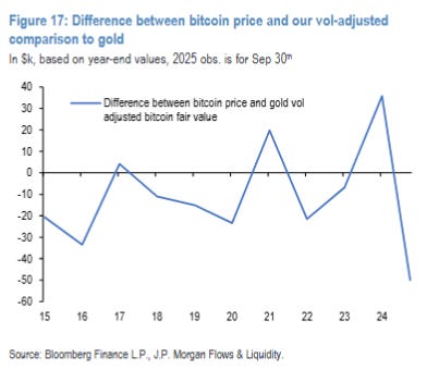 “The steep rise in the gold price over the past month has made bitcoin more attractive to investors relative to gold…the market cap of bitcoin at $2.3 trillion currently would have to rise by close to 42% (implying a theoretical bitcoin price of $165k), to match on a vol-adjusted basis the around $6 trillion of total private sector investment in gold via ETFs or bars and coins... ...This mechanical exercise thus could imply significant upside for bitcoin.”