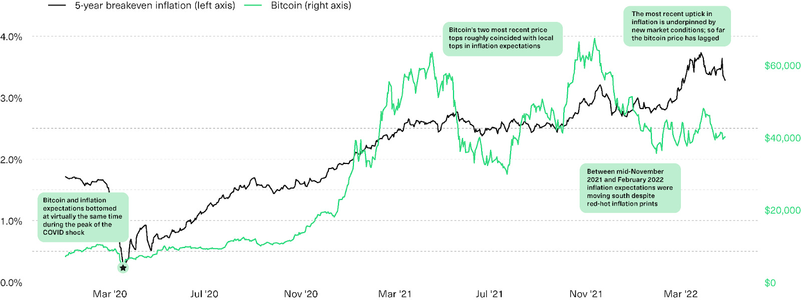 Bitcoin daily price (in USD, on the right axis) and five-year breakeven inflation (% on the left axis). Data from January 1, 2020 to April 25, 2022.