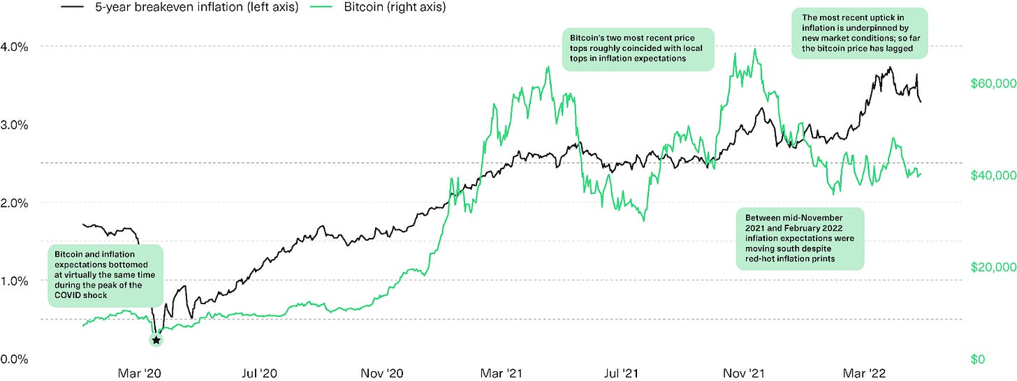 The chart above shows an imperfect, sometimes laggy, but most of the time clear relationship between the price of bitcoin and inflation expectations. For example, bitcoin bottomed during the COVID crisis virtually at the same time inflation expectations did, and the April and November 2021 bitcoin market tops also roughly coincided with local tops in inflation expectations.